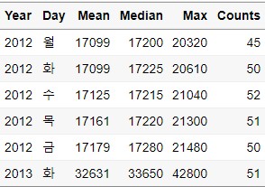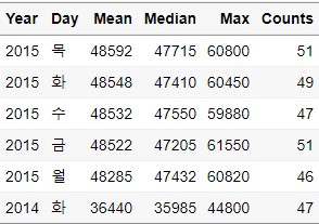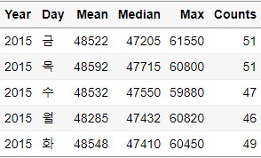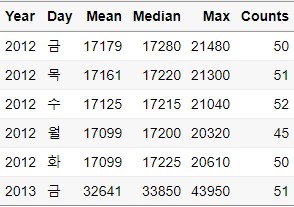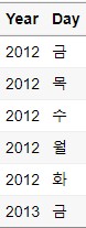 $ Day : Factor w/ 5 levels "금","목","수",..: 1 2 3 4 5 1 2 3 4 5 ...