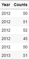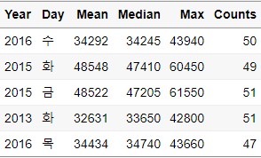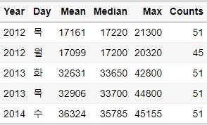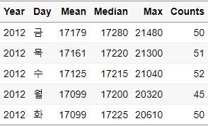 distinct(Year,Day,Mean,Median,Max,Counts)