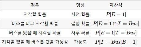 이경우, 교통편에서 버스를 선택(관측)한 후, 지각확률을 계산하였다는 의미로 사후확률이라 정의합니다.