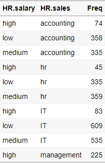 TABLE2 = as.data.frame(xtabs(~ HR$salary + HR$sales))